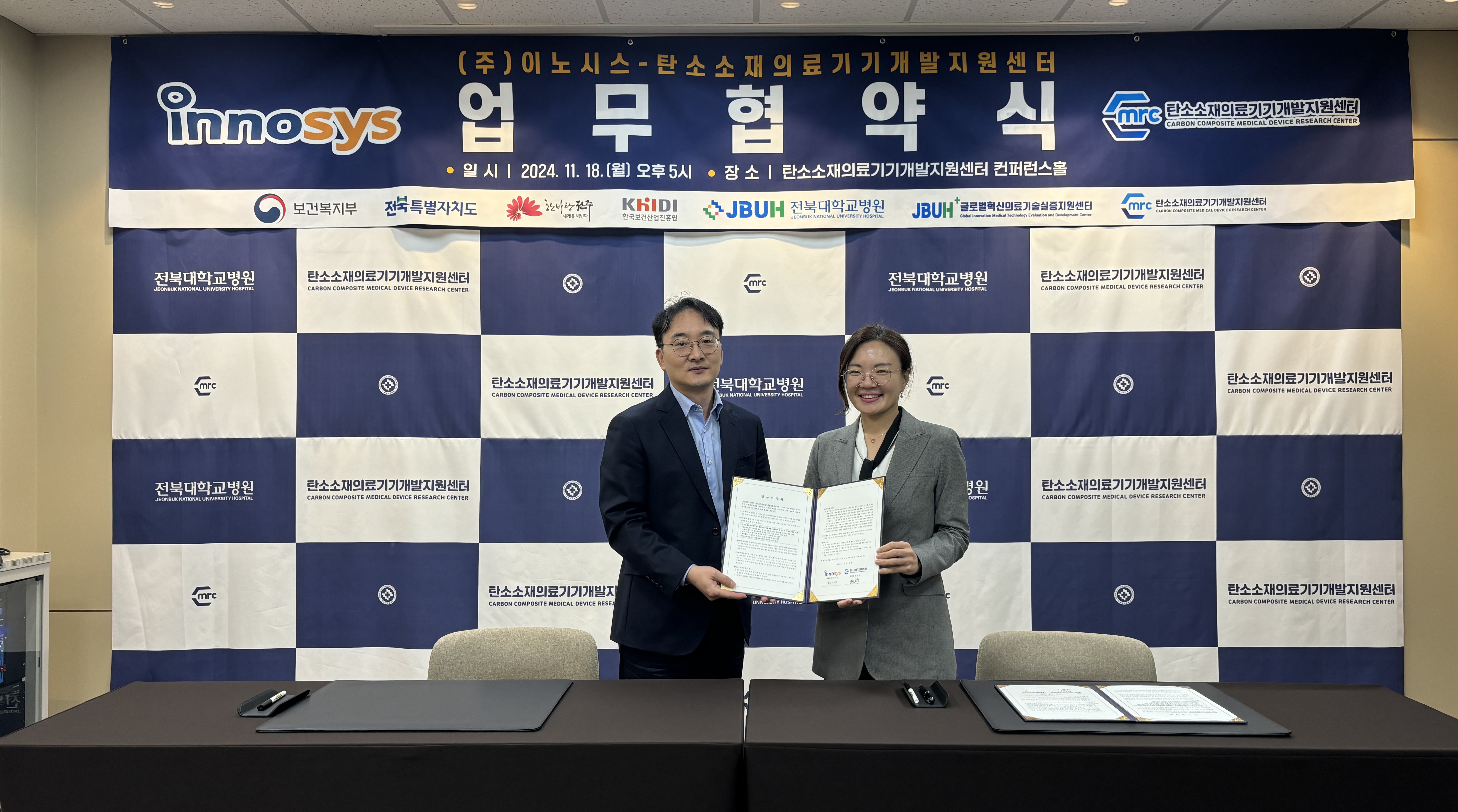 전북대학교병원(병원장 양종철)은 18일 이노시스 주식회사(대표이사 정주미)와 글로벌 의료기기 시장 친출을 위한 업무협약을 체결했다.