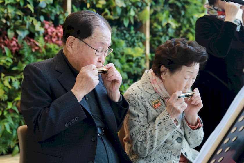 [데일리메디 박대진기자] 건양대병원 로비에 하모니카 앙상블 연주가 울려 퍼졌다. 소리를 따라간 곳은 ‘아이빅원 하모니카 앙상블’과 97세의 김희수 건양교육재단 설립자 겸 명예총장 부부의 합주 무대.
