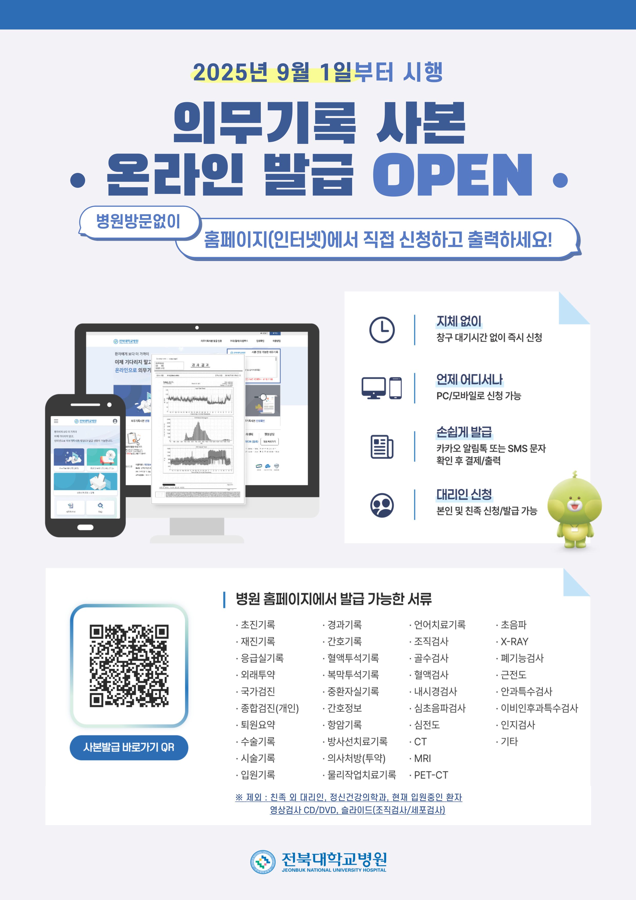 [데일리메디 백성주기자] 전북대학교병원(병원장 양종철)이 환자 편의성을 높이고 고객 서비스 만족도를 향상시키기 위해 ‘의무기록 사본 온라인 발급 서비스’를 시작했다고 5일 밝혔다.