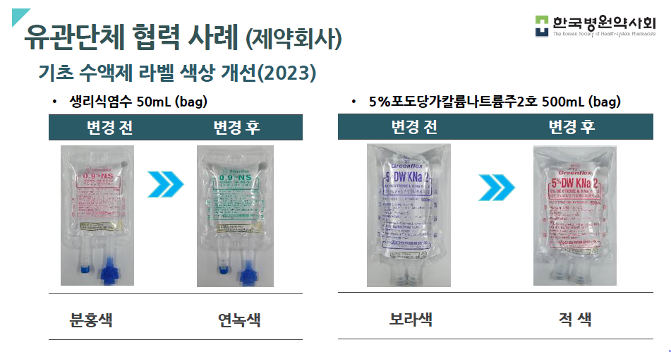윤 부센터장은 “지난해 대한약품·HK이노엔·JW중외제약 등 기초수액제 생산 주요 회사와 협의하고 병원간호사회 의견을 수렴해 기초수액제 라벨 색상을 통일했고, 올해 1월부터 출하되고 있다”고 소개했다.