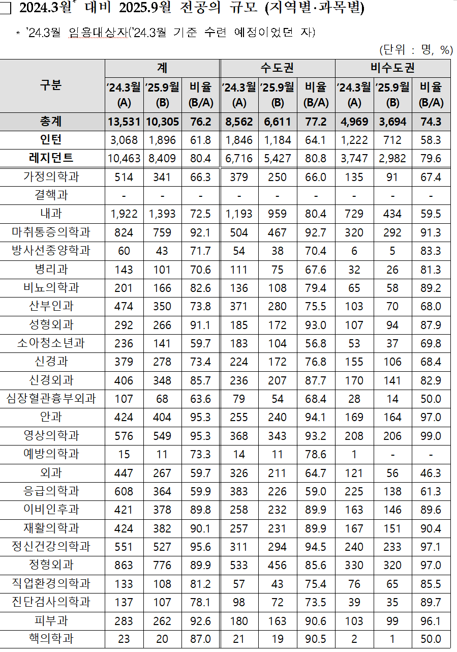 예년 대비 전공의 규모 비율을 연차별로 보면, 인턴 61.8%, 레지던트 80.4%이며, 지역별로는 수도권 수련병원이 77.2%, 비수도권 수련병원이 74.3% 수준을 회복한 것으로 나타났다.