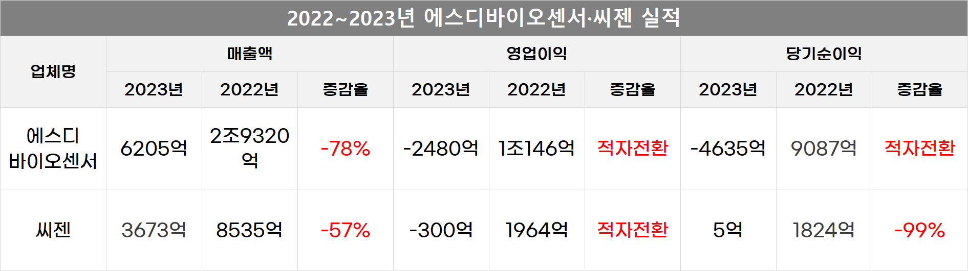 국내 진단키트 업계 양대산맥으로 불리는 SD바이오센서와 씨젠이 지난해 나란히 적자로 돌아섰다. 코로나19 팬데믹 수혜가 축소되면서 실적 하락을 피하지 못했다는 분석이다.