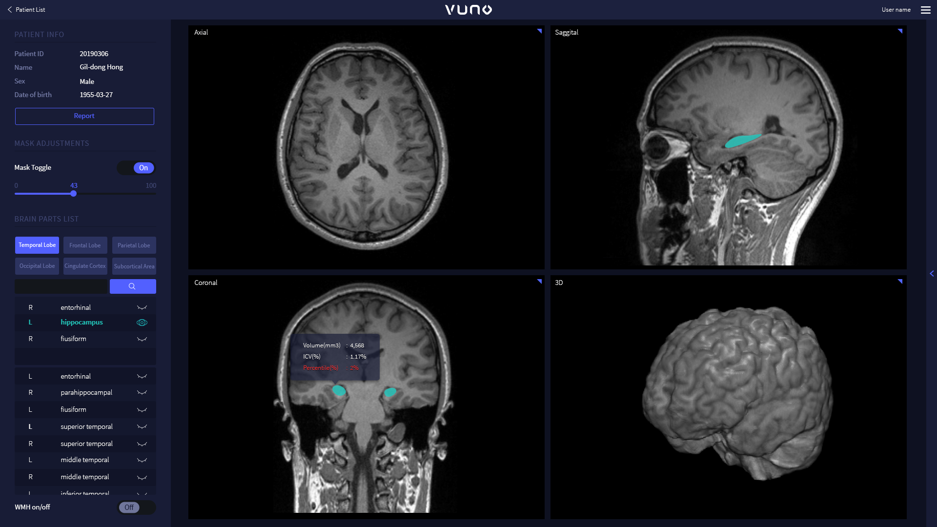 뷰노메드 딥브레인은 딥러닝을 기반으로 뇌 자기공명영상(MRI)을 분석해 뇌 영역을 100여 개 이상으로 분할하고 각 영역 위축 정도를 정량화한 정보를 1분 내 제공하는 AI 의료기기다.