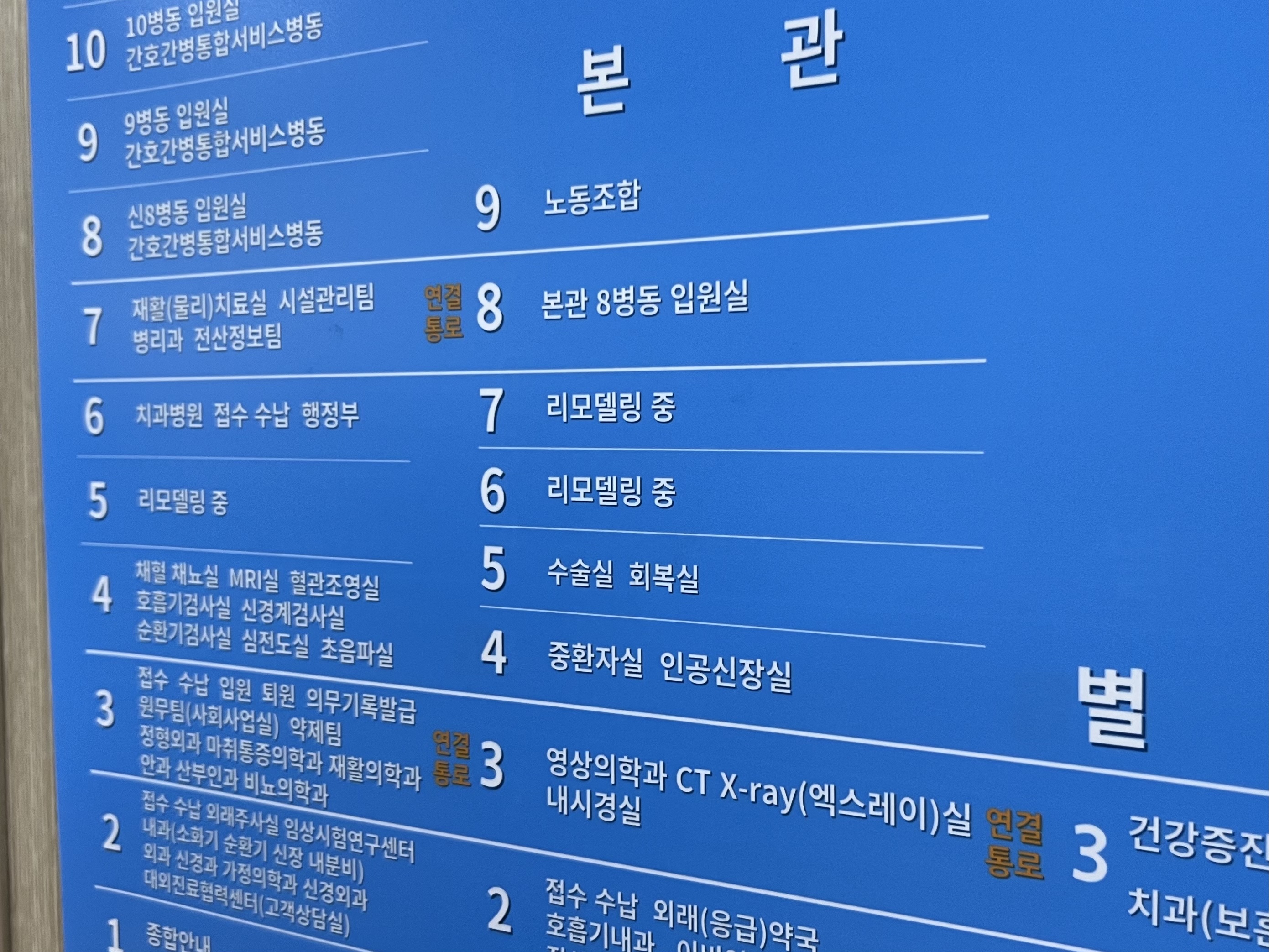 안과는 지난 6월부터 오후 진료를 중단해 운영을 제한하고 있으며, 본관 6~7층은 대규모 리모델링 공사가 진행 중이다. 별관에 위치한 치과병원 일부 공간은 리모델링을 거쳐 다른 용도로 전환되고 있고, 공사 구간에는 가림막과 안내문이 설치돼 층간·동간 이동 동선이 일부 제한되고 있다. 병원 복도에는 낙상주의 안내판, 대기 의자, 휠체어 등이 환자 동선에 맞춰 정돈돼 있다.