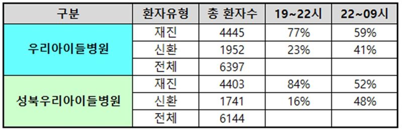 실제 우리아이들병원의 경우 저녁 7시부터 밤 10시까지의 신환 비율은 23%, 밤 10시부터 오전 9시에는 41%로 집계됐다.