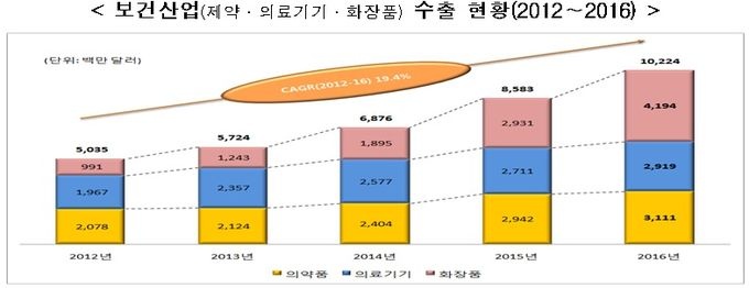 보건복지부(장관 정진엽)에 따르면 2016년 의약품, 의료기기, 화장품 등 보건산업 수출은 11조9000억원을 기록했고, 1140억원의 흑자를 냈다. 무역수지 흑자 전환은 사상 처음이다.