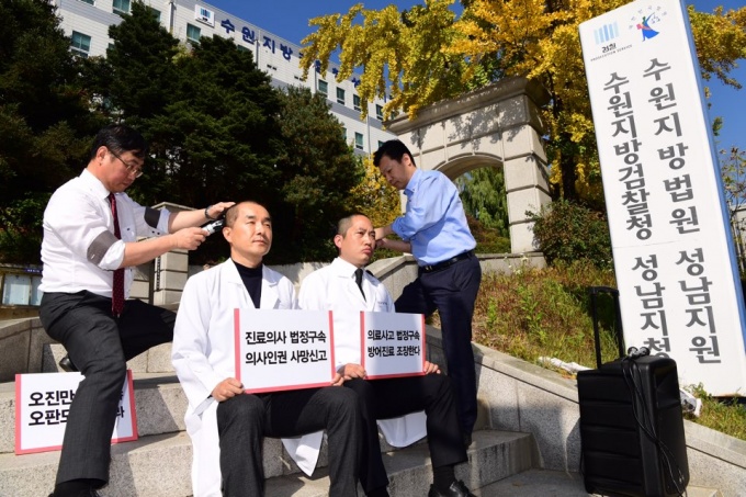 [데일리메디 정승원 기자] 대한의사협회 최대집 회장과 방상혁 상근부회장 등 임원진이 의료사고로 인해 의사가 구속된 사건에 반발하며 수원지방법원 성남지원 앞에서 25일 삭발시위를 단행했다.