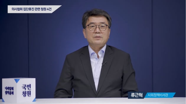 류 비서관은 '파업을 강행한 대한의사협회에 강력히 대응해달라', '공공의대 정책을 철회해달라' 등 의료정책을 둘러싼 청원이 이어진 것에 대해서는 "정부는 의료계와 함께 협의체를 구성해 발전적인 정책 방향을 모색할 것"이라는 원론적 답변을 내놨다.