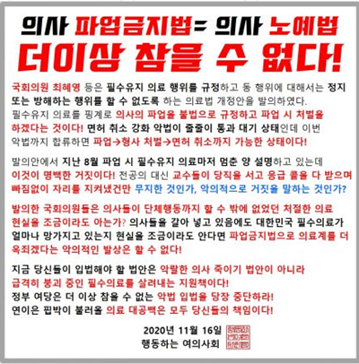 행동하는 여의사회 '의사파업금지법=의사노예법'