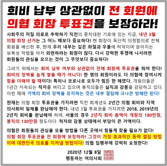 [데일리메디 임수민 기자] 행동하는 여자의사회가 회비 납부와 무관하게 전 회원에게 대한의사협회 회장 투표권을 보장하라고 촉구했다.