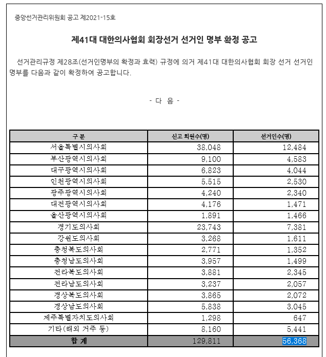 [데일리메디 임수민 기자] 제 41대 대한의사협회장 선거인 명부가 확정됐다. 선거에 참여하겠다고 신고한 12만9811명의 의사 중 5만6368명이 투표를 할 수 있게 됐다. 지난 40대 의협회장 선거인 명부 4만4012명보다 약 1만2000명 많은 수치다.