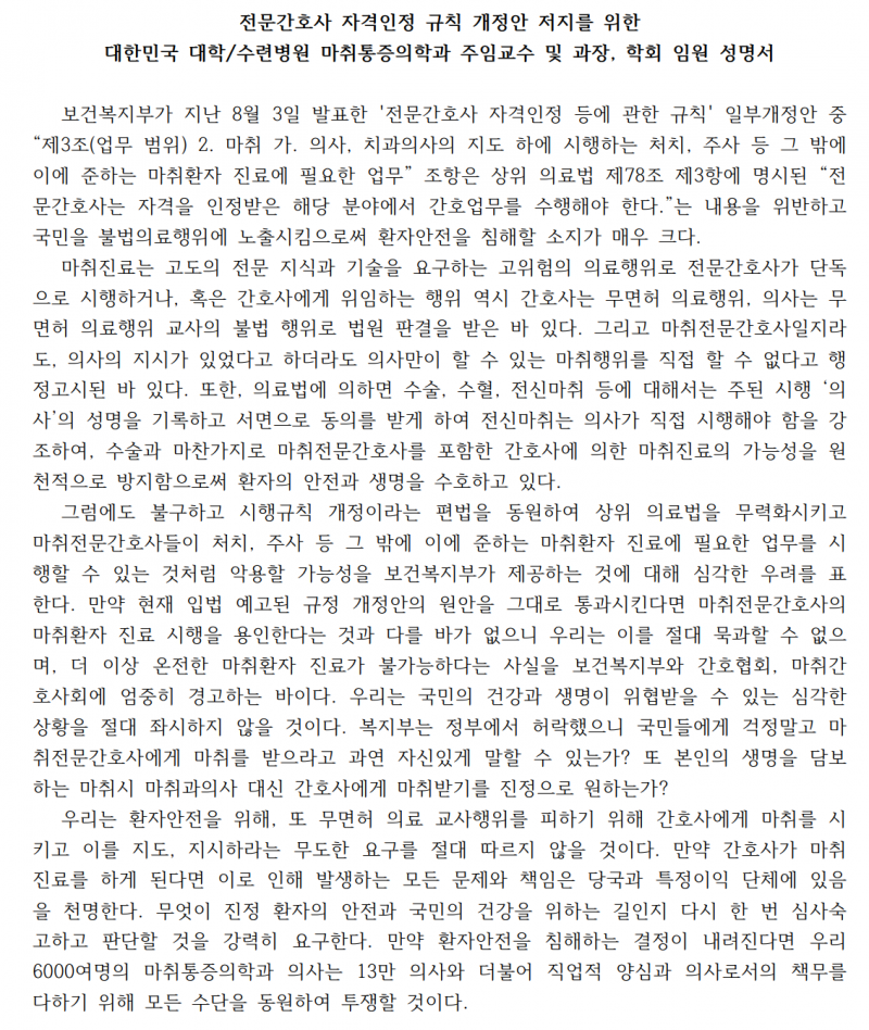이들은 “마취는 수술과 함께 고도의 전문지식과 기술을 요구하는 행위로, 간호사가 대체하는 것은 불가하다”며 개정안의 철회나 수정을 요구했다.