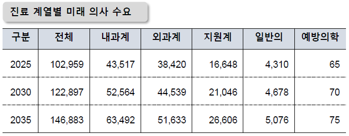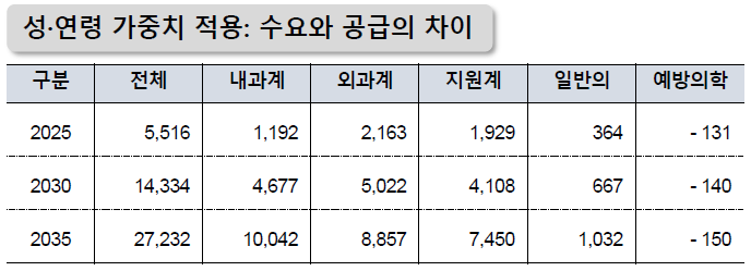 그러면서도 “여성 의사 증가 추이 등을 감안해 성·연령별 가중치를 적용한다면 실질 공급량은 더욱 줄어든다”며 “이 경우에는 2035년 총 2만7232명이 부족하다”고 덧붙였다.