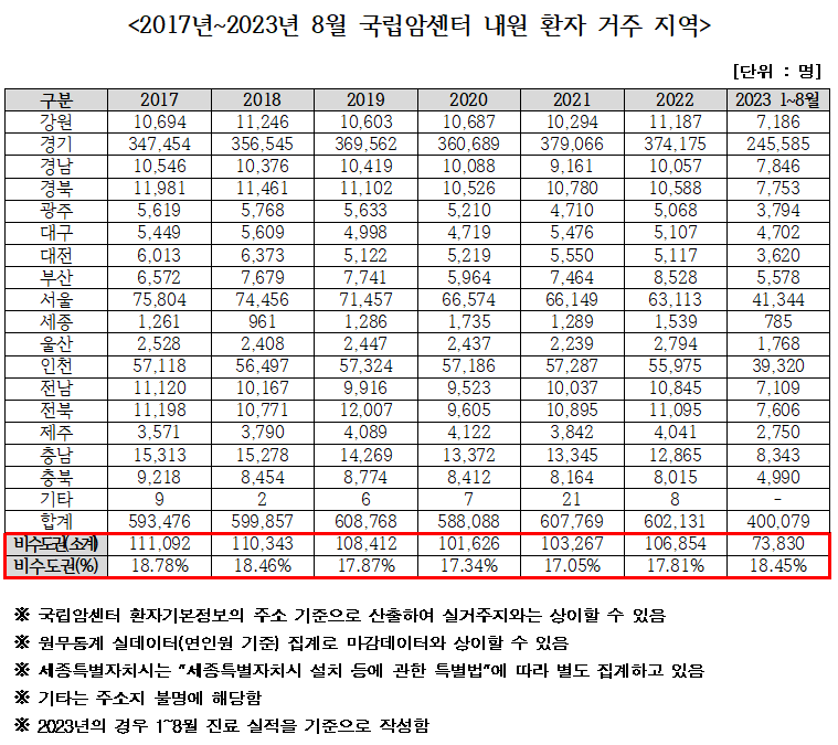 24일 국립암센터가 국민의힘 이종성 의원실에 제출한 자료에 따르면 지난해 국립암센터 환자 60만117명 중 비수도권에 주소지를 두고 있는 이들이 10만6854명(17.8%)인 것으로 집계됐다.
