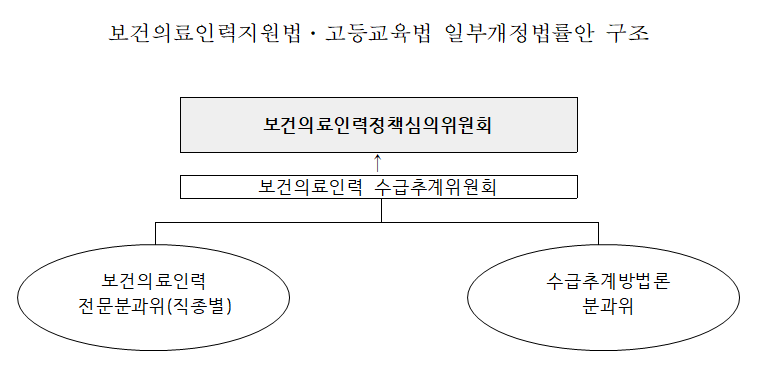 이를 위해 보건의료인력정책심의위원회 산하에 '보건의료인력 수급추계위원회'를 설치하고, 직종별로 구성된 '전문 분과위'와 사회적 합의를 이룰 수 있는 '수급추계방법론 분과위'를 둔다.
