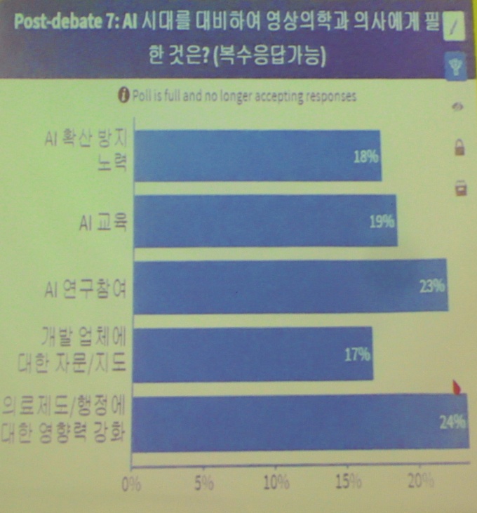 최윤섭 대표에 따르면 영상의학회 학술대회에서 현장 설문조사를 진행한 결과, 응답자 중 18%가 "AI 시대에서 영상의학과 의사에게 필요한 것은 ‘AI 확산 방지 노력'이라고 답했다"고 밝혔다.