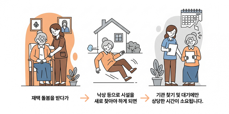 그러다가 낙상 등으로 입소요양이 필요해지면 기관 탐색부터 서류 준비, 계약까지, 모든 절차를 다시 처음부터 반복해야 한다. 이 과정에서 발생하는 돌봄 공백은 오롯이 보호자의 몫이다. 어르신 본인도 보호자도 모두 지치고 불안해지는 악순환이 반복되는 것이다.