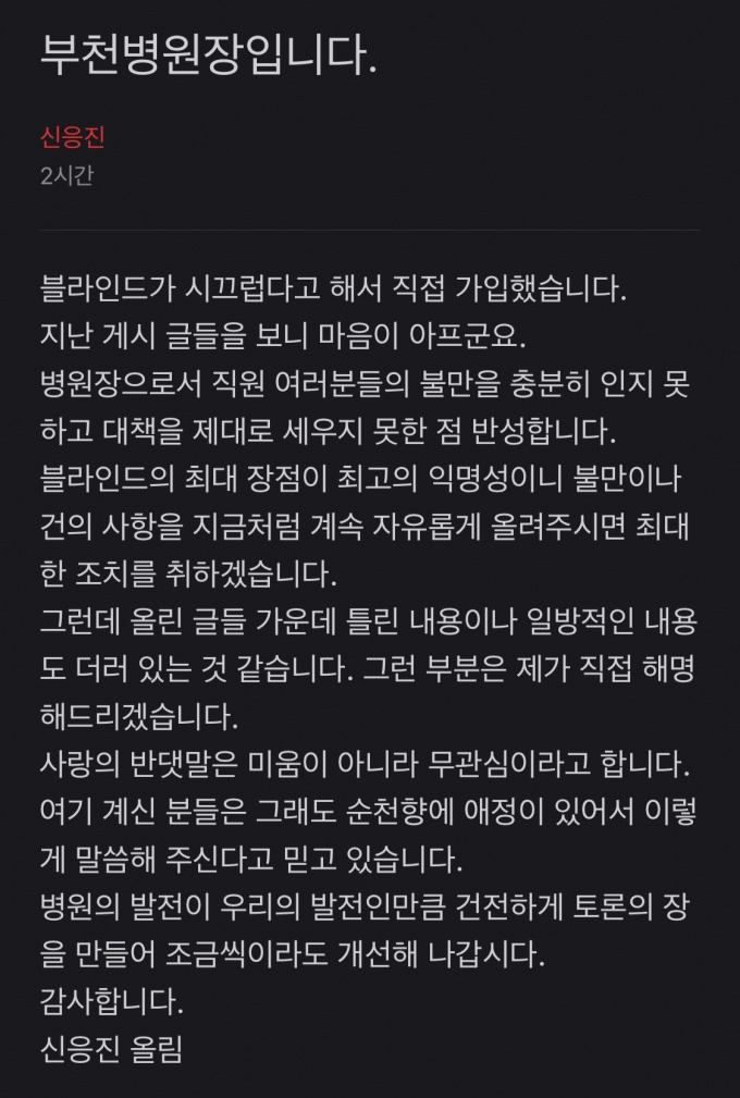 최근 블라인드에 ‘부천병원장입니다’라는 제목의 글이 올라와 화제. 이 글의 작성자는 순천향대부천병원장인 ‘신응진’이라는 실명 닉네임을 사용. 작성자는 글을 통해 “블라인드가 시끄럽다고 해서 직접 가입했다. 지난 게시 글들을 보니 마음이 아프다. 병원장으로서 직원 여러분의 불만을 충분히 인지하지 못하고 대책을 제대로 세우지 못한 점 반성한다”고 유감을 표명. 이어 “블라인드의 최대 장점이 익명성이니 불만이나 건의 사항을 지금처럼 자유롭게 올려주면 최대한 조치를 취하겠다”고 약속.