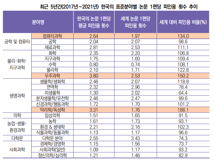 2021년 논문 1편당 피인용 횟수에서는 약리학·독성학, 우주과학, 컴퓨터과학 등이 임상의학을 앞섰다.