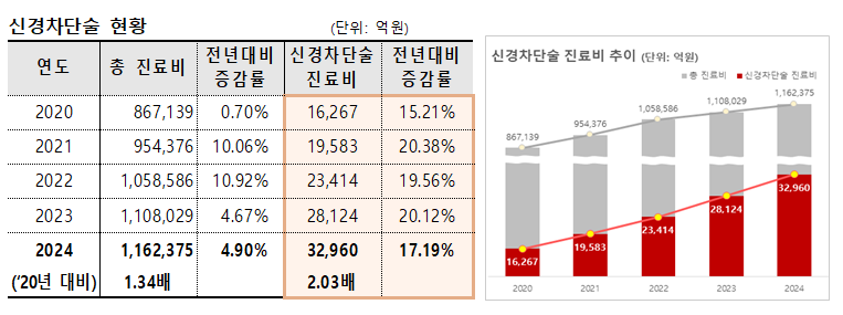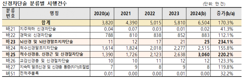 건보공단에 따르면 2024년 신경차단술 수진자는 965만명으로, 총 6504만건의 시술이 이뤄졌다. 이에 따른 진료비는 3조 2960억원에 달해 2020년 1조6267억원 대비 2.03배 증가했다.