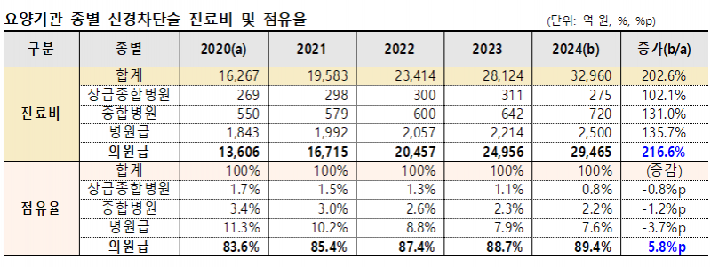 의원급 신경차단술 진료비는 5년간 216.6% 급증했으며, 전체 진료비 중 의원급이 차지하는 점유율은 2020년 83.6%에서 2024년 89.4%로 5.8%p 확대됐다.