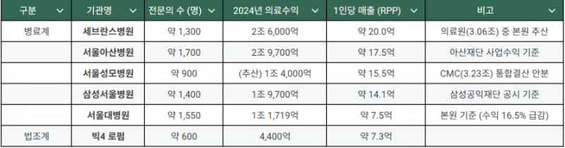 특히 로펌은 높은 영업이익률을 기록하는 반면 빅5 병원은 2024년 의료이익 적자만 수 천억원에 달할 정도로 수익 구조가 악화된 상태다. 매출 규모만 클 뿐 실속은 로펌에 크게 뒤지는 셈이다.