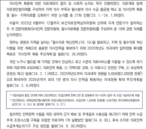 반면 의대생 집단 휴학, 전공의 집단 사직, 의료공백과 비상진료체계 가동 등 국민 불편은 언급하지 않았다는 설명이다.