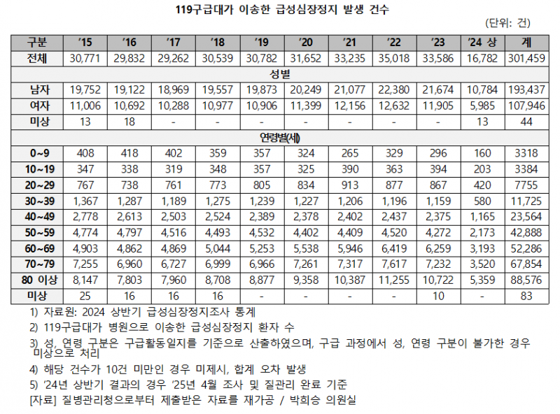 7일 국회 보건복지위원회 박희승 의원(더불어민주당)이 질병관리청으로부터 제출받은 자료를 분석한 결과, 급성심장정지 환자 수는 지난 2015년 3만771건에서 2023년 3만3586건으로 9.1% 증가했다.