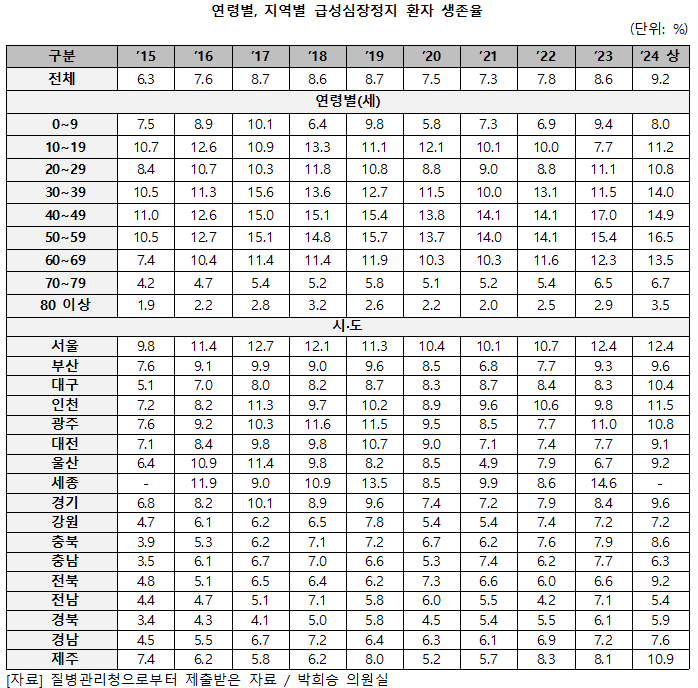 급성심장정지 환자 생존율은 2015년 6.3%에서 2024년 상반기 기준 9.2%로 다소 높아졌다. 그러나 여전히 10건 중 9건은 사망에 이르고 있다. 지난해 80세 이상 생존율은 3.5%에 불과했다.