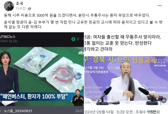 조국 조국혁신당 대표가 "윤석열 대통령과 김건희 여사가 천공 교사를 받고 무통 주사를 환자 부담으로 하게 바꿨다"고 주장했다.