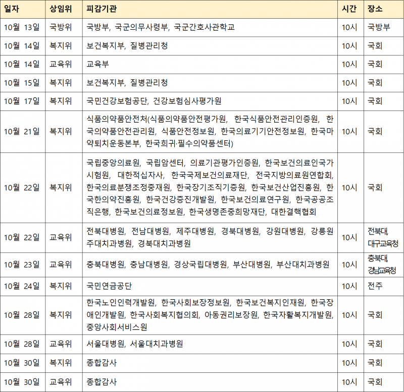 10월 14일 교육부·22~23일 국립대병원·28일 서울대병원···13일 국군의무사령부