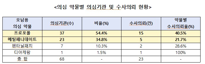 주요 의심 약물별 수사의뢰 현황은 △프로포폴 37개소 중 15건(40.5%) △메틸페니데이트 23개소 중 5건(21.7%) △펜타닐패치 7개소 중 2건(28.6%) △디아제팜 1개소 중 1건(100%)이다.