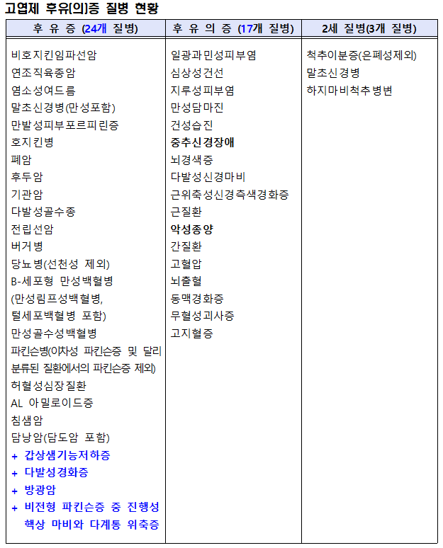 월남전 참전유공자 등이 앓고 있는 질병 중 ▲방광암 ▲다발성경화증 ▲갑상샘기능저하증 ▲비전형 파킨슨증 중 진행성 핵상 마비와 다계통 위축증 등 4개 질환이 고엽제후유증 질병으로 추가 인정된다.