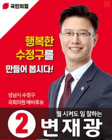 현재 성남 수정구 국민의힘 예비후보는 변재광 원장을 비롯해 장영하 변호사, 전미숙 시민단체 대표 등 3파전 양상이다.