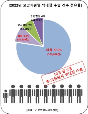 실소연에 따르면, 지난 2022년 심평원 자료에서 요양기관별 백내장 수술 건수 점유율은 의원이 77.5%(약 57만건)으로 가장 높았으며 이어 병원(9.5%), 상급종합병원(7%), 종합병원(6%) 순으로 나타났다.