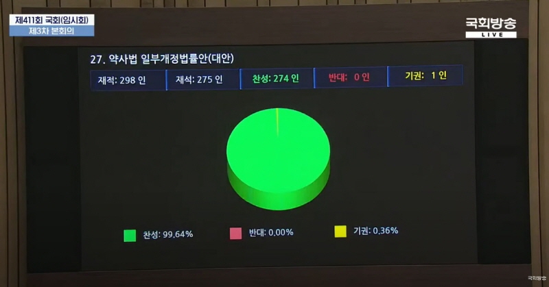 28일 열린 국회 본회의에서 약사법 일부개정법률안과 의료법 일부개정법률안이 통과됐다. 약사법 개정안은 재석 275인 중 찬성 274인, 기권 1인 등으로, 의료법 개정안은 재석 272인 중 찬성 272인으로 통과됐다.