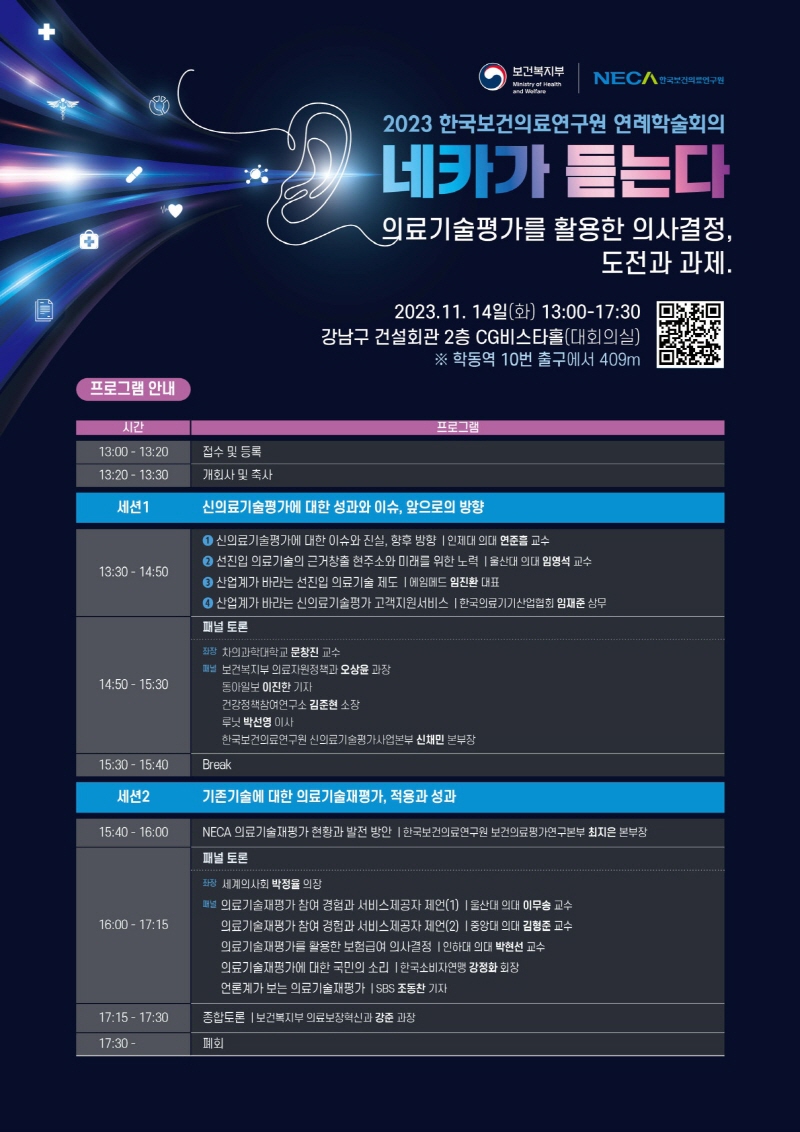 좌장은 박정율 세계의사회 의장이 맡으며, 최지은 보의연 보건의료평가연구본부장이 ‘NECA 의료기술재평가 현황과 발전 방안’에 대해 발표한다.
