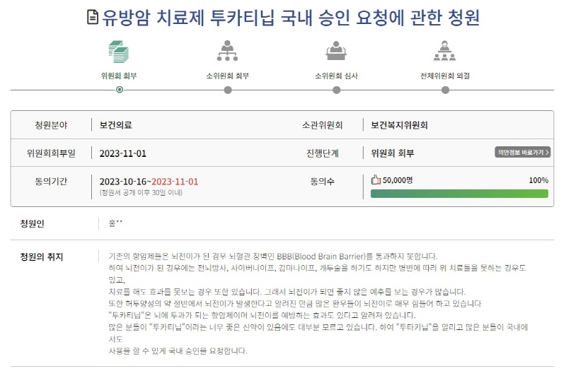 국회 국민동의청원에 따르면, 한 유방암 환자가 지난 10월 16일 올린 ‘유방암 치료제 투카티닙 국내 승인 요청에 관한 청원’이 보름만인 지난 11월 1일 동의한 사람이 5만명에 도달했다.