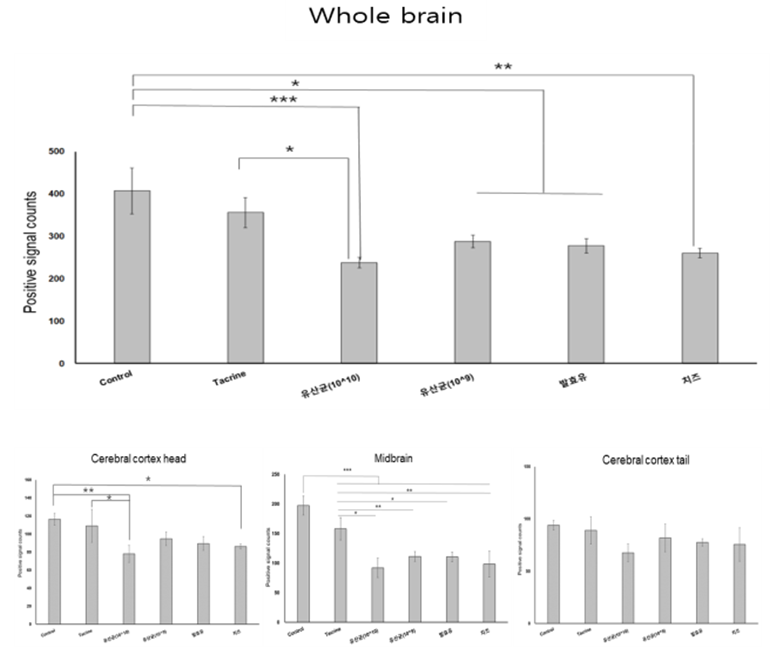 그 결과 아무것도 먹이지 않은 집단은 뇌 조직에 베타아밀로이드 플라크가 침착됐고, 선발 유산균과 이를 함유한 유제품을 먹인 집단에서는 플라크 침착이 크게 줄었다.
