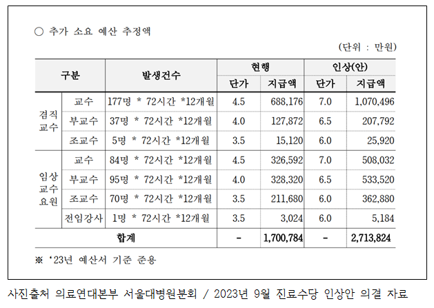 올해 서울대병원은 의사직에 '진료기여수당' 명목 성과급으로 435억원의 예산을 편성했고, 이에 더해 올해 취임한 김영태 병원장은 469명 의사에게 '진료수당'으로 100억원 추가지출을 결정했다.