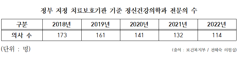 또 이곳에 근무하는 정신건강의학과 전문의는 2018년 173명에서 작년 114명으로 59명 줄었다.