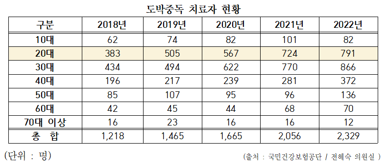 이 자료에 따르면 지난 2018년부터 2022년까지 도박중독으로 치료받은 환자 수는 1218명에서 2329명으로 91% 증가했다. 특히 20대에서는 383명에서 791명으로 2배 이상 급증했다.