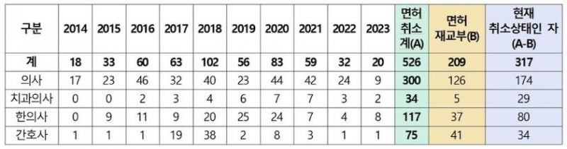 의사 중에서는 면허 취소자의 42%인 126명이 재교부를 받았다. 간호사는 54.78%인 41명이, 한의사는 31.6%인 37명이, 치과의사는 14.7%인 5명이 각각 면허를 다시 받았다