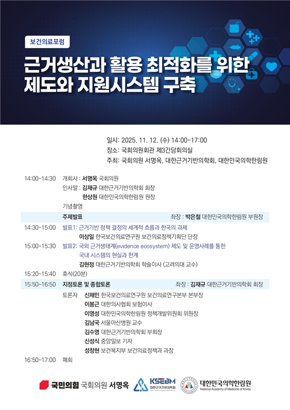 이를 위해 국회의원 서명옥, 대한민국의학한림원, 대한근거기반의학회가 공동 주최자로 나섰다.