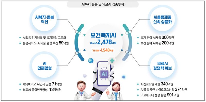 복지‧의료 분야 AI 응용 제품의 신속한 상용화 지원을 위해 500억원이 신규 편성됐고, 의료AI 경쟁력 확보 예산은 2025년 876억원에서 2026년 1714억원으로 2배 가까이 인상됐다.