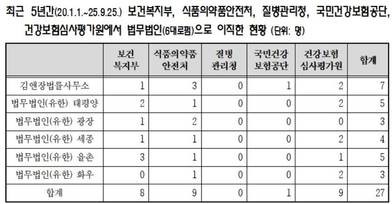 최근 5년간 보건복지부, 식품의약품안전처 산하 보건의료 기관에서 대형 로펌으로 이직한 27명 중 건강보험심사평가원(심평원) 출신이 9명에 달하는 반면, 국민건강보험공단(공단) 출신은 1명에 그친 것으로 나타났다.