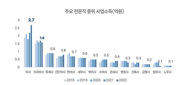 우리나라 전문직 중 의사 평균 사업소득이 가장 높은 것으로 나타났다. 지난 2014년부터 2022년까지 의사의 평균 소득은 4억원, 중위소득은 2억7000만원으로 집계됐다.