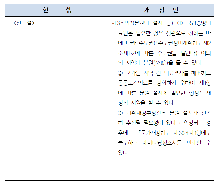 또 '기획재정부 장관은 분원 설치가 신속히 추진될 필요성이 있다고 인정되면 예비타당성 조사를 면제할 수 있다'는 내용이 담겼다.