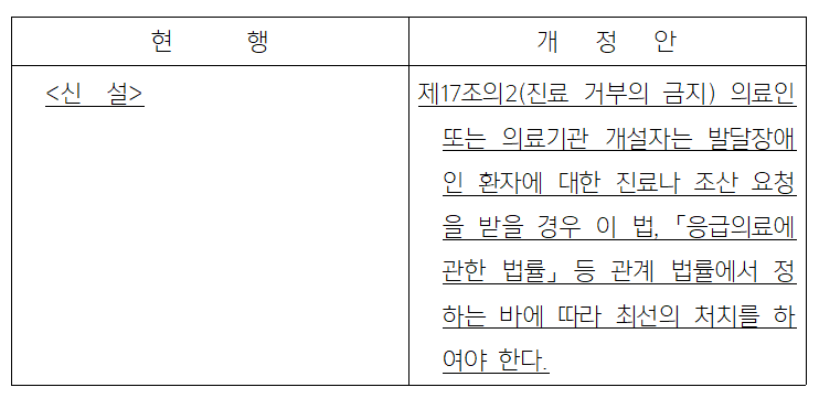 진료거부 금지 관련 내용인 현행법 제15조에 '의료기관 개설자는 장애인 환자에게 이 법 및 장애인차별금지 및 권리구제 등에 관한 법률 등에서 정하는 최선의 처치를 하도록 한다'는 조문을 신설하는 것이다.