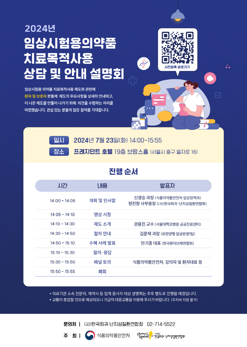 식약처는 환자 눈높이에 맞춰 제도 이해를 도와 활용도가 높아질 수 있도록 임상시험용의약품 처방 의사, 의약품 제공 업체, 투여 환자 등 다양한 이해관계자를 강연·토론자로 섭외했다.